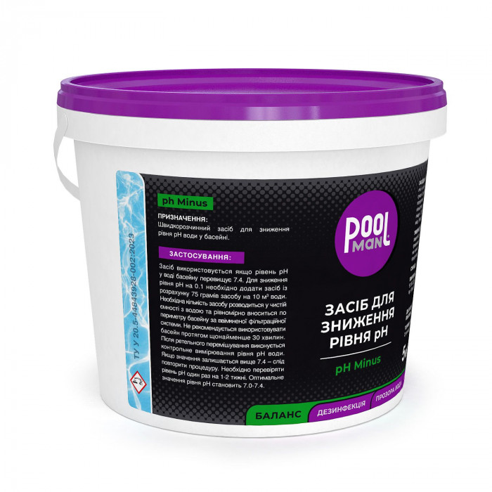 Застосування: Засіб використовується якщо рівень pH у воді басейну перевищує 7.4. Для зниження рівня рН на 0.1 необхідно додати засіб із розрахунку 75 грамів засобу на 10 м3 води. Необхідна кількість засобу розводиться у чистій ємності з водою та рівномірно вноситься по периметру басейну за ввімкненої фільтраційної системи. Не рекомендується використовувати басейн протягом щонайменше 30 хвилин. Після ретельного перемішування виконується контрольне вимірювання рівня рН води. Якщо значення залишається вище 7.4 – слід повторити процедуру. Необхідно перевіряти рівень рН один раз на 1-2 тижні. Оптимальне значення рівня рН становить 7.0-7.4.