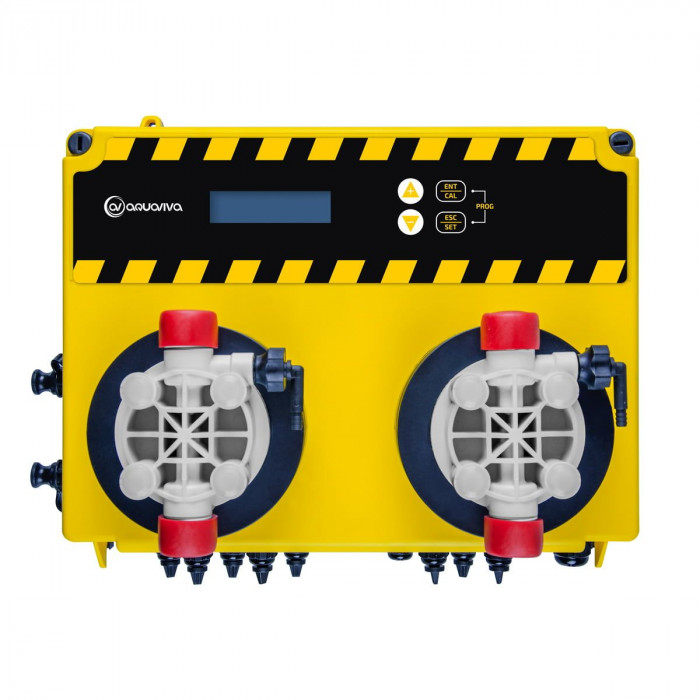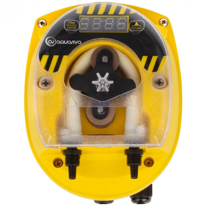 Перистальтичний насос Aquaviva універсальний з таймером. Оптимальне рішення для дозації рідких реагентів та засобів для чищення у сфері обслуговування технічних конструкцій (басейни, аквапарки, виробництва). Принцип дії такого насоса заснований на передавленні еластичної трубки механічним вузлом, внаслідок чого забезпечується постійна протока рідини. Реагенти, що перекачуються, не контактують з вузлами насоса, завдяки чому обладнання відрізняється надійністю і мінімальною потребою обслуговування. Серія насосів Aquaviva PR використовує високоякісні трубки із сантопрену — повністю зшитого термопластичного еластомеру TPE. Сантопрен не схильний до впливу більшості хімічних складів, включаючи гіпохлорит натрію та соляну кислоту.