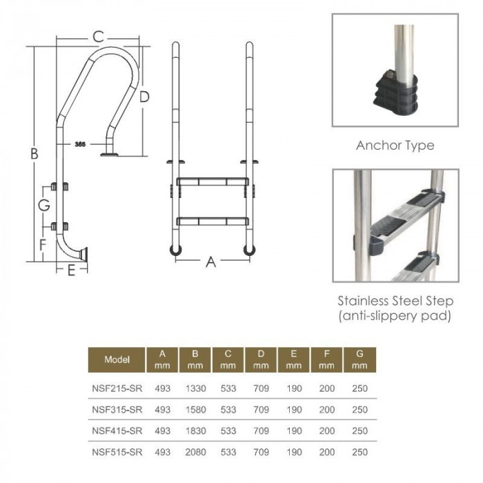 Сходи Emaux NSF215-SR призначені для зручного та безпечного спуску в басейн. Поручні та сходи виготовлені з полірованої нержавіючої сталі марки AISI-304. Поручні кріпляться до борту за допомогою пластикових склянок (анкерів). Нижня частина сходів упирається у стіну басейну прогумованої заглушкою. Щаблі кріпляться до поручнів за допомогою болтів. Сходи призначені для заглиблених басейнів. У комплекті поставляються елементи кріплення.