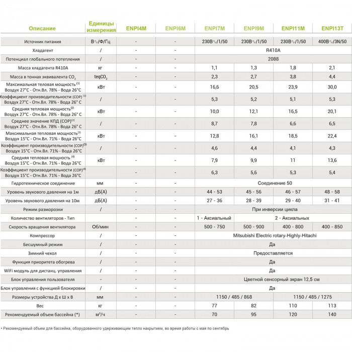 Повноінверторний тепловий насос Hayward Energyline Pro 9M. Призначений для нагрівання та охолодження води, у приватних та комерційних басейнах, об’ємом до 95 м³. Запатентована технологія IN-TechFull Inverter – комбінація роботи інверторного компресора CPS Mitsubishi та інверторного вентилятора DC. Це дозволяє підтримувати потрібну температуру води з економією електроенергії до 30%. Великий та інформативний РК-дисплей. Можливість віддаленого Wi-Fi керування.