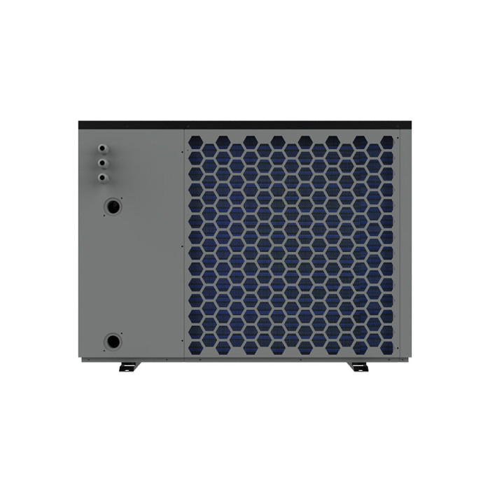 Корпус виготовлено із високоякісного металу з матовим покриттям, що є типовим для високопродуктивних теплових насосів для басейнів.